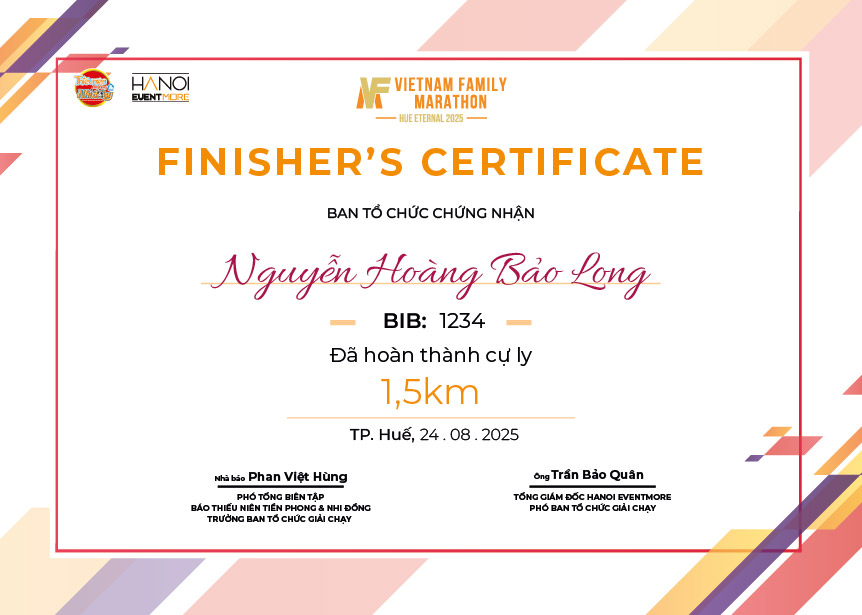 1,5KM: Hành trình nhẹ nhàng dành cho VĐV mọi lứa tuổi (VĐV dưới 5t phải đăng ký cùng người giám hộ), với cung đường từ Phu Văn Lâu đến Trường Quốc Học Huế. Lý tưởng để các cá nhân hoặc các gia đình cùng con trải nghiệm thể thao đầu đời.